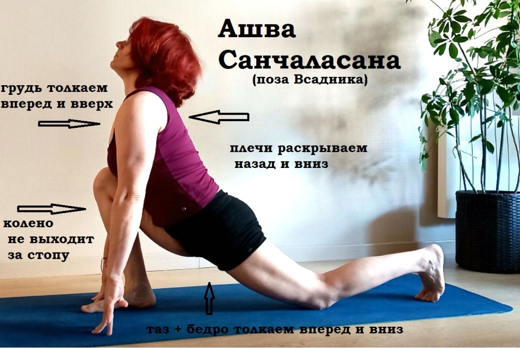 Поза Всадника делается на вдох (руки можно поднимать вверх, чтобы дополнительно стимулировать вытяжение ППМ, а Ардха Хануманасана – на выдох. Важно следить за тем, чтобы линия позвоночника в обоих положениях максимально вытягивалась.