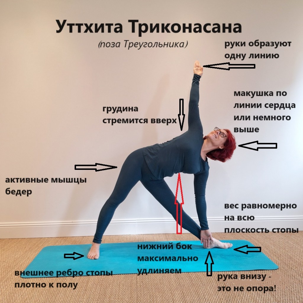 Скажу честно, Триконасану я не понимала долго. Обладая достаточной для ее выполнения гибкостью, я легко касалась нижней стопы и недоумевала, что такого важного в этой асане. Первый проблеск осознания появился на 3 -4 году ее выполнения, а еще через два –  глубина опыта (то, что я называю: постичь асану на 100%).