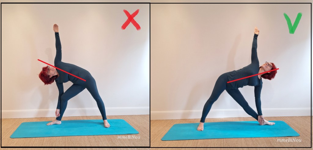 ПРАВИЛЬНО: держать ноги прямыми и крепкими, а позвоночник – вытянутый в прямую ось. В этом хорошо помогает понятие «плоская поза», какой является Триконасана.