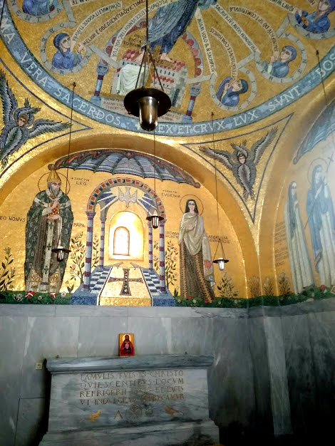 Святая Одилия стала первой аббатисой монастыря, где после смерти (13.12.720 г н.э.) ее тело поместили в саркофаг. Я была в часовне, но не посмела сделать фото в таком месте… На территории есть несколько маленьких часовен с потрясающими мозаиками,вторая на фото — святой Евгении (не знак разве? Ведь мою дочь зовут Евгения). С тех пор монастырь многократно обворовывали, разрушали и снова восстанавливали (последняя реконструкция была в 17 веке).