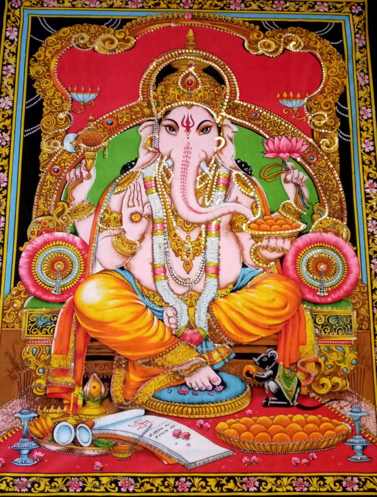 Считается, что размер ладду должен соответствовать 1 -2 укусам для дегустации, а не утоления голода. Смею вас заверить: больше 4 штучек съесть не удается, — уж очень сытное любимое лакомство Ганеши :) Кстати, его очень часто изображают с целым блюдом ладду, вы же помните изображение в студии?