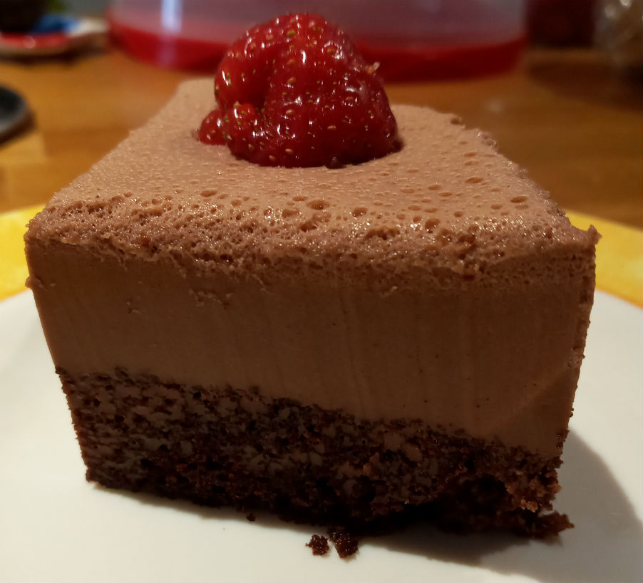 Мусс готовится просто: нужно прогреть сливки с сахаром и какао на малом огне, добавив уже набухший желатин. Кипятить не надо – лишь бы желирующее вещество растворилось в сладкой смеси. Далее 1 -2 минуты взбиваем венчиком массу, слегка наполнив ее воздушными пузырьками и затем выливаем на бисквит. Отправляем торт в холодильник до полного застывания верхнего слоя (у меня на это ушло не более часа). Сверху украшаем так, как нравится: клубника – это идеальное сочетание для шоколада(а когда она своя- вдвойне приятно).