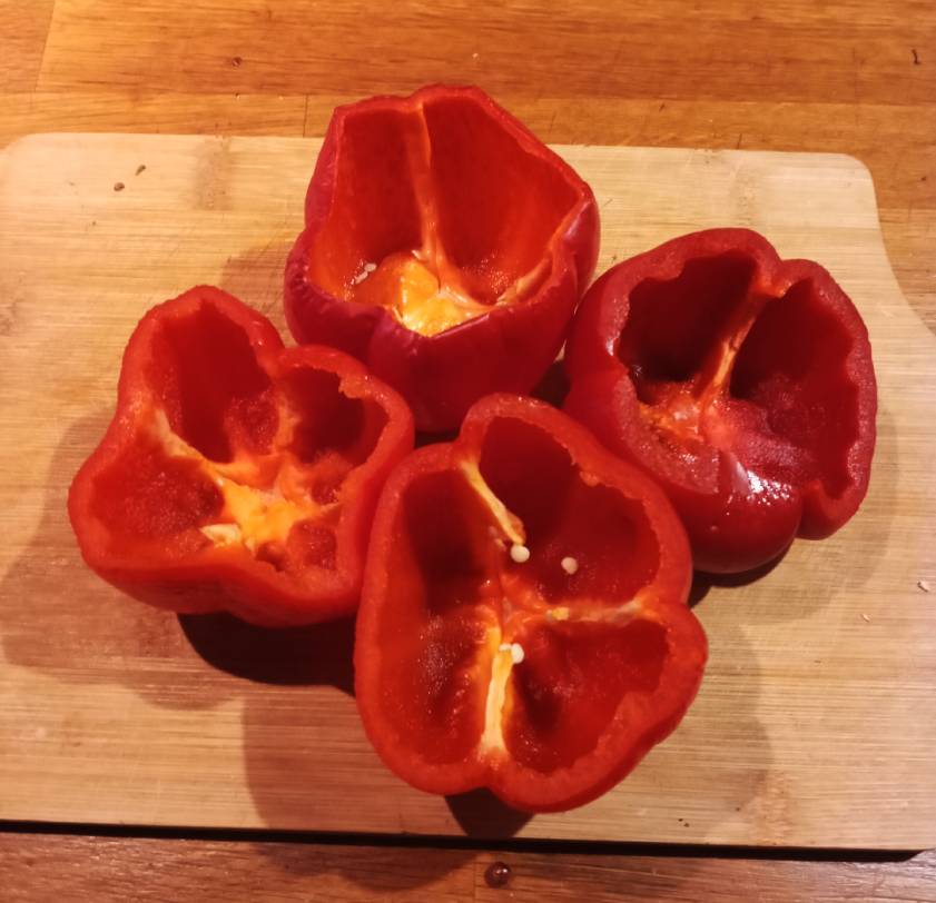 У меня завалялся болгарский перец – 4 штуки, причем слегка приплюснутые, но широкие — очень удобно такие фаршировать, — они не падают набок в кастрюле. Удаляем у них семечки, аккуратно срезая верхушку.