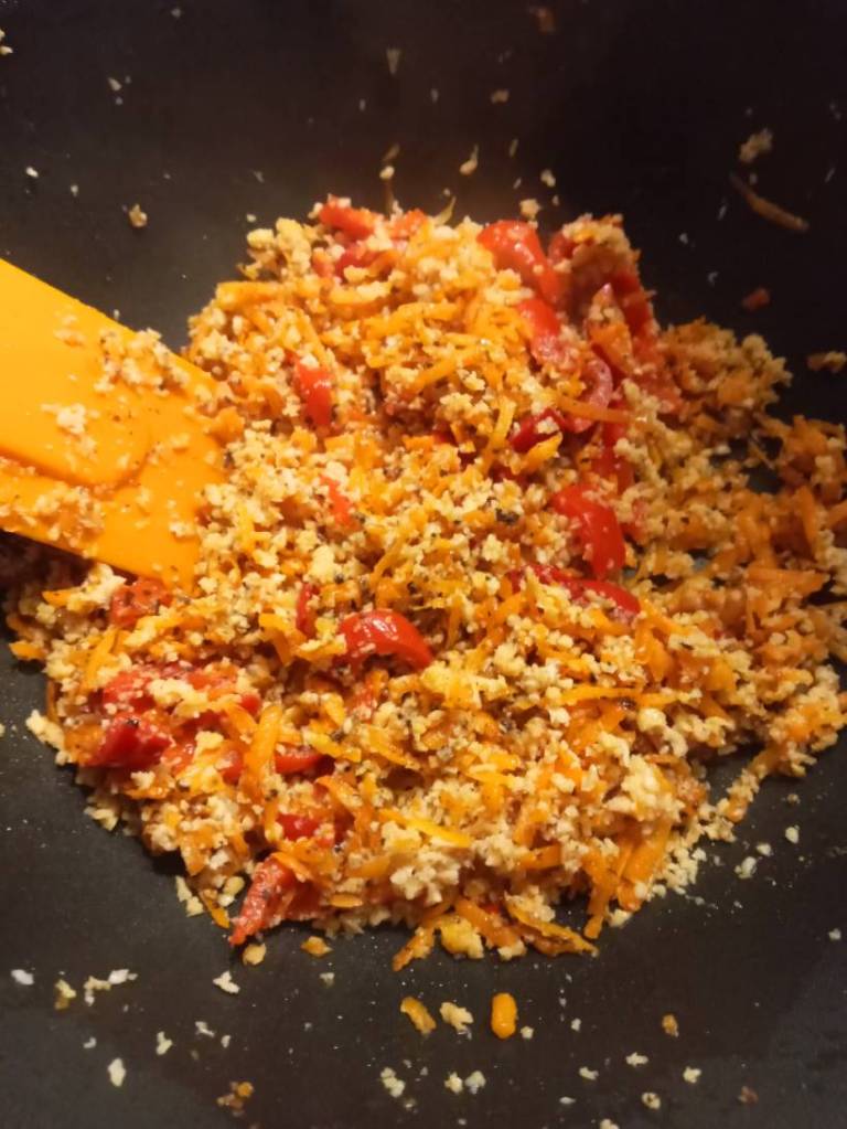 Лук мелко нарезать и спассеровать в 2 -3 ст.л. постного масла, добавить тертую морковку и протушить около 5 минут (очень удобно использзовать сковороду-вок). У редварительно замоченного соевоего продукта удалить воду, измельчить в кухонном комбайне до небольших кусочков (или пропустить через мясорубку). Блендером не стоит, так как масса станет похожей на пластелин, а желательно чтобы имитация мяса была ближе к натуральному.