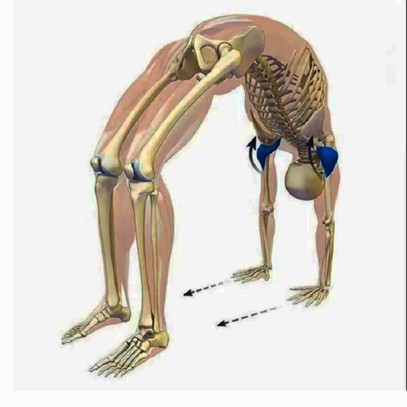 - Стопы ставим обычно на ширину плеч, но на первых этапах входа в Мост допускается шире, так как не у всех поясница и область крестца достаточно свободна для прогиба такого рода.