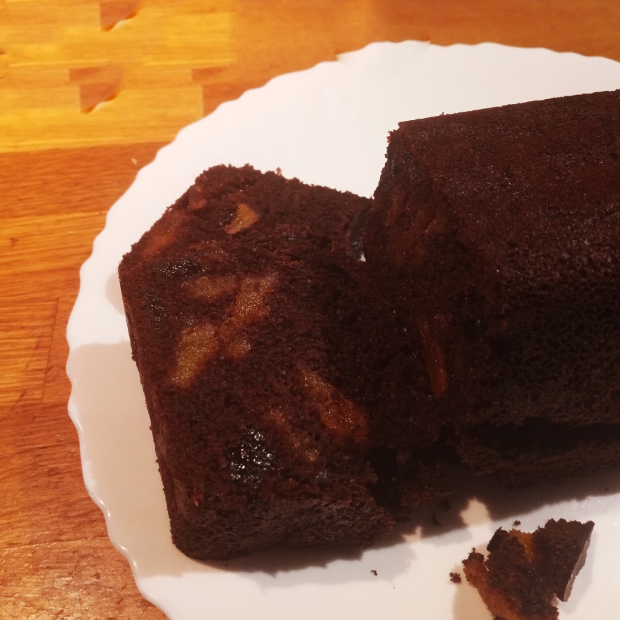 Теперь внимание: принцип приготовления состоит в том, что вы смешиваете в одной посуде все сухие ингредиенты, а в другой – все жидкие. Далее соединяете все вместе, добавляете сухофрукты, перемешиваете и перекладываете готовое тесто в форму для выпечки, предварительно смазанную маслом. Выпекаем простой шоколадный кекс в духовке при температуре 200 градусов до готовности. И если вам хватит выдержки – не разрезайте его до остывания (хотя подозреваю, что вы не сможете продержаться так долго).