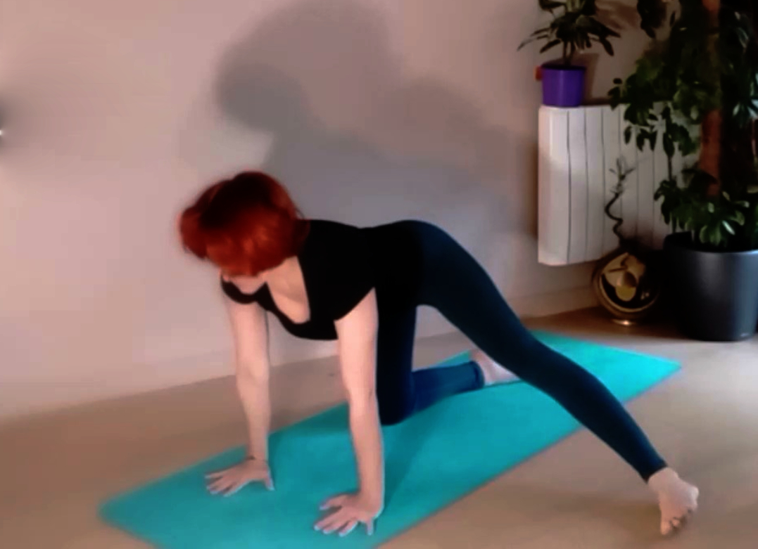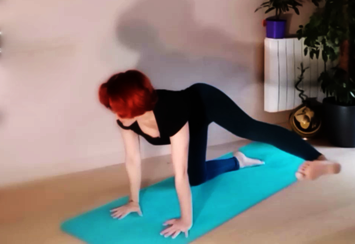 Вариация Чакравакасаны с ногой, отведенной в сторону под прямым углом, первоначально мало кому дается, не переживайте об этом. Сразу пытайтесь просто сохранить корпус в одной плоскости, не перекашивая плечи или таз (почитайте о базовом положении). Далее пробуйте выдвинуть прямую (!!!) ногу вбок, перемещая ее прямо по полу. Важно, чтобы стопа находилась в одной плоскости с тазом, — часто ее недотягивают, а особо гибкие наоборот, упорно тянут к голове (что вообще не нужно).