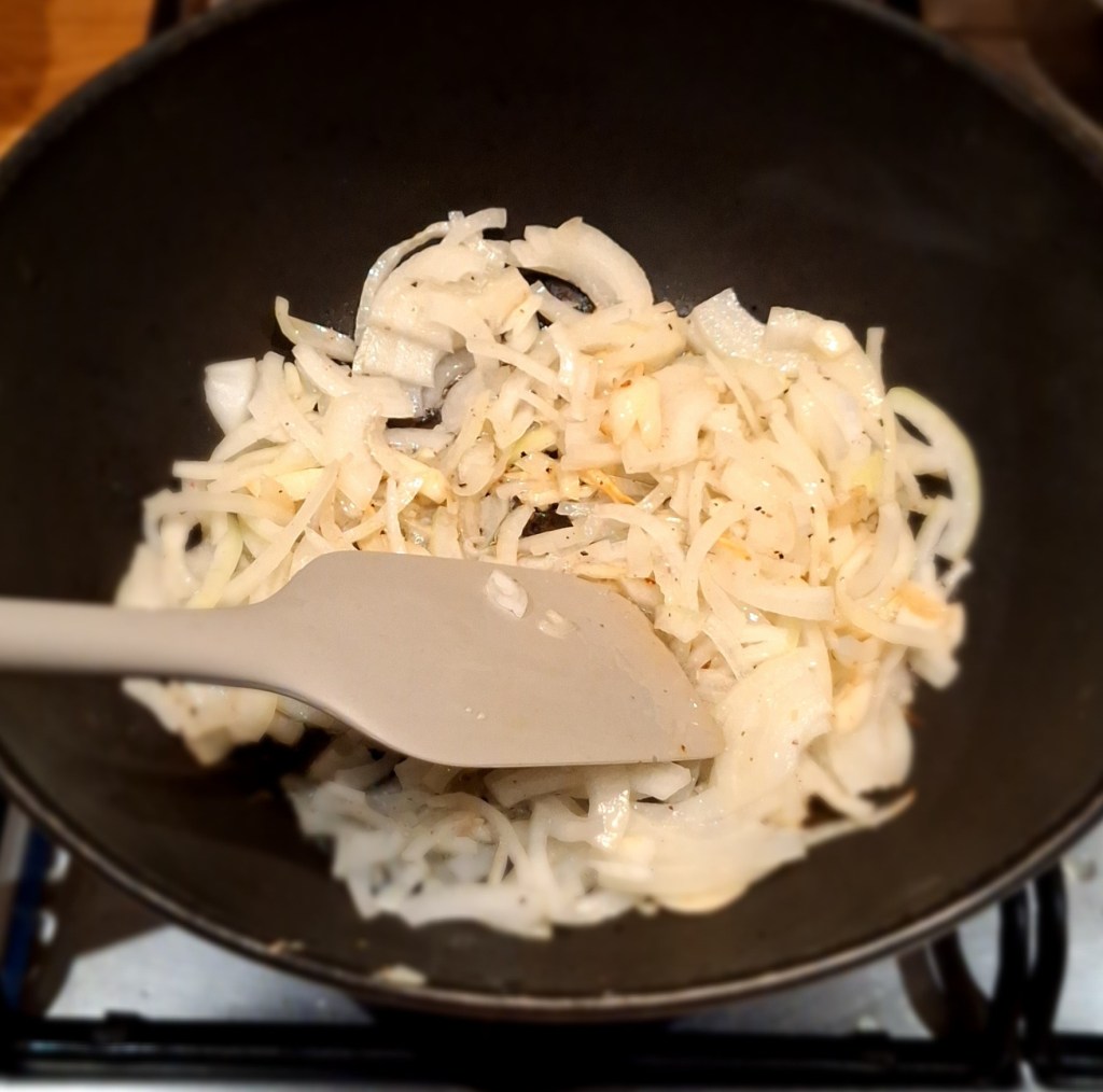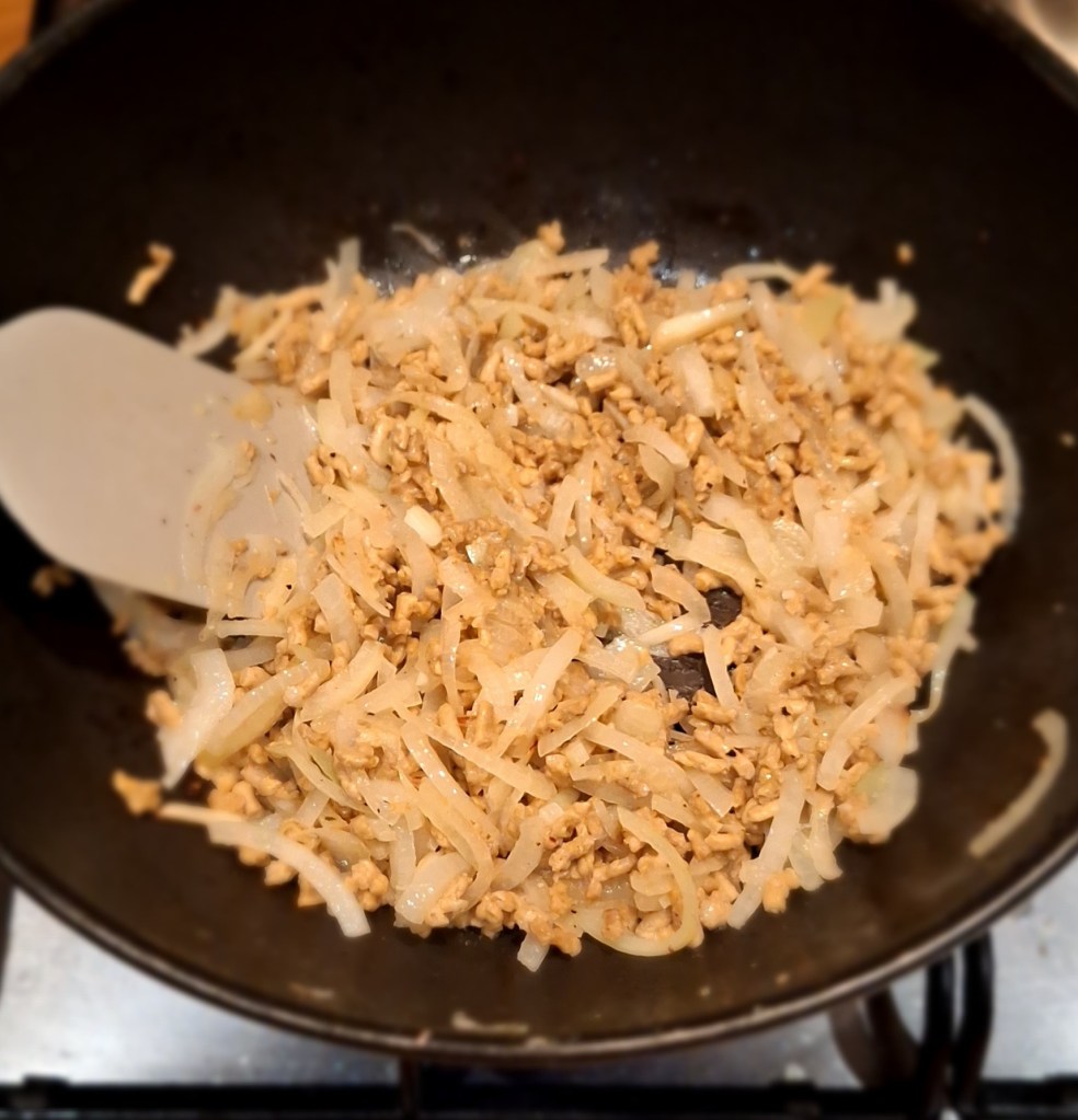 Лук нашинковать тонкими полу-кольцами (или четвертинками, главное потоньше) и обжарить в 3 ст.л. растительного масла до мягкости. Добавляем туда же замоченное соевое мясо, слив остатки воды (отжимать не надо).