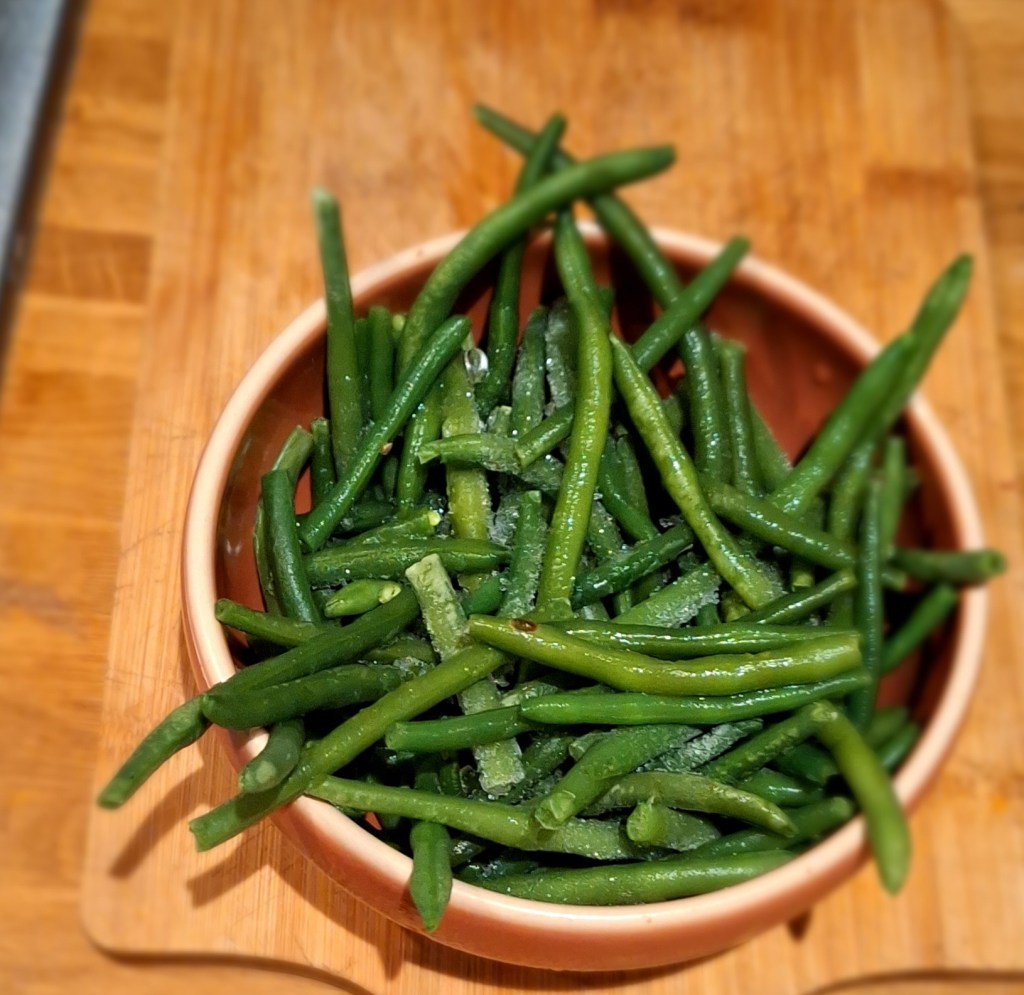 - Две щедрых горсти зеленой стручковой фасоли (если замороженая, то предварительно разморозьте, оставив в комнате на час-другой). Столько же отваренных макарон (возможно остались со вчера?).