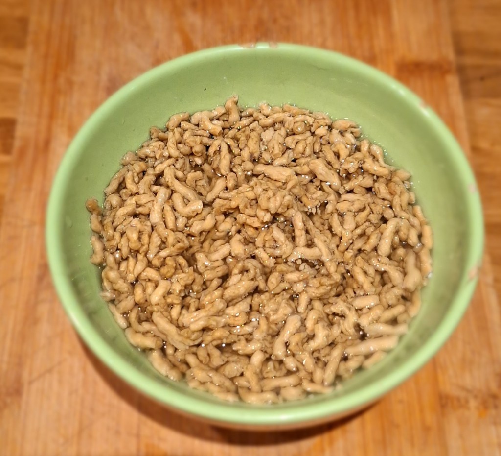 - 4 -5 ст. ложек сухого соевого протеина заливаем холодной водой и оставляем минут на десять — пятнадцать.