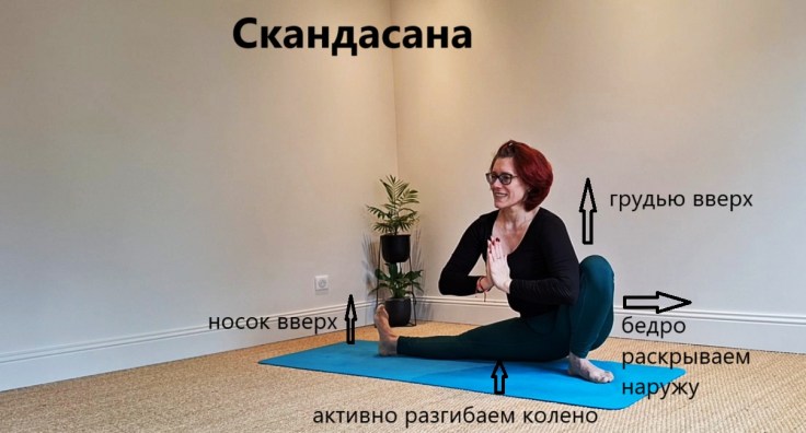 Эта поза новичкам не дается, так как является асаной среднего уровня, но как можно ее упростить, я рассказываю в видео на моем канале. Выполняя Скандасану мы постепенно: