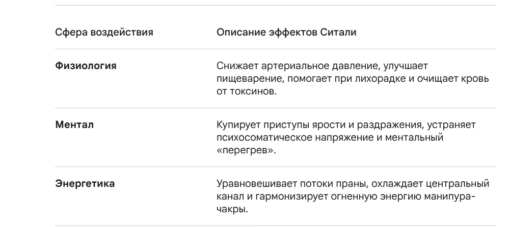Влияние Ситали на физическое тело связано прежде всего с нервной системой. Медленное дыхание активирует парасимпатическую нервную систему, которая отвечает за восстановление и расслабление. Постепенно снижается частота сердечных сокращений, уменьшается внутреннее возбуждение, дыхание становится глубже и спокойнее. Практика также усиливает слюноотделение и мягко стимулирует пищеварение. В жаркую погоду или после активной практики она действительно помогает уменьшить ощущение перегрева, проверено многократно!